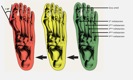En parallèle, la première et la deuxième phalange du gros orteil s'inclinent dans la direction opposée, pointant vers l'extérieur du pied.