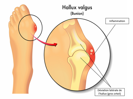 Le 1er métatarsien , l'os situé juste derrière le gros orteil, se déporte vers l'intérieur du pied. Cette déviation peut être si prononcée que sa tête forme une voile osseuse visible et saillante sur le côté du pied.