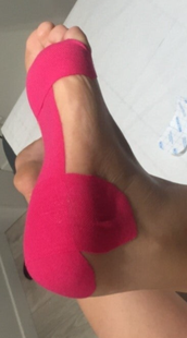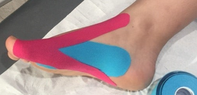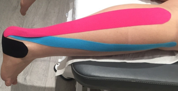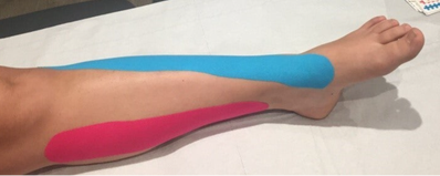 Un tape sera appliqué de façon tonifiante (en bleu) sur tout le trajet du tibial antérieur, simultanément un autre tape sera apposée sur le trajet du tibal postérieur pour le détonifier. Cette synergie permet un soulagement immédiat de la douleur.