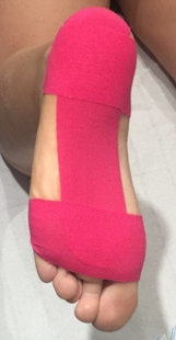 L'abducteur de l'hallux étant plus en médial, le tape sera appliqué le long du trajet du muscle en partant du gros orteil jusqu'au talon. Pour améliorer le soulagement, un tape jungle est ajouté pour réduire provisoirement l'hallux valgus associé à la douleur.